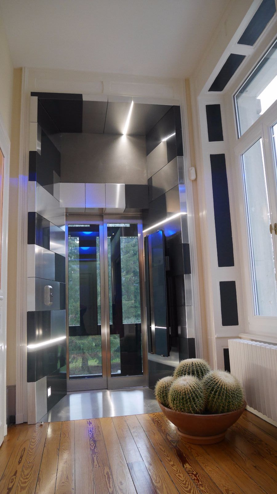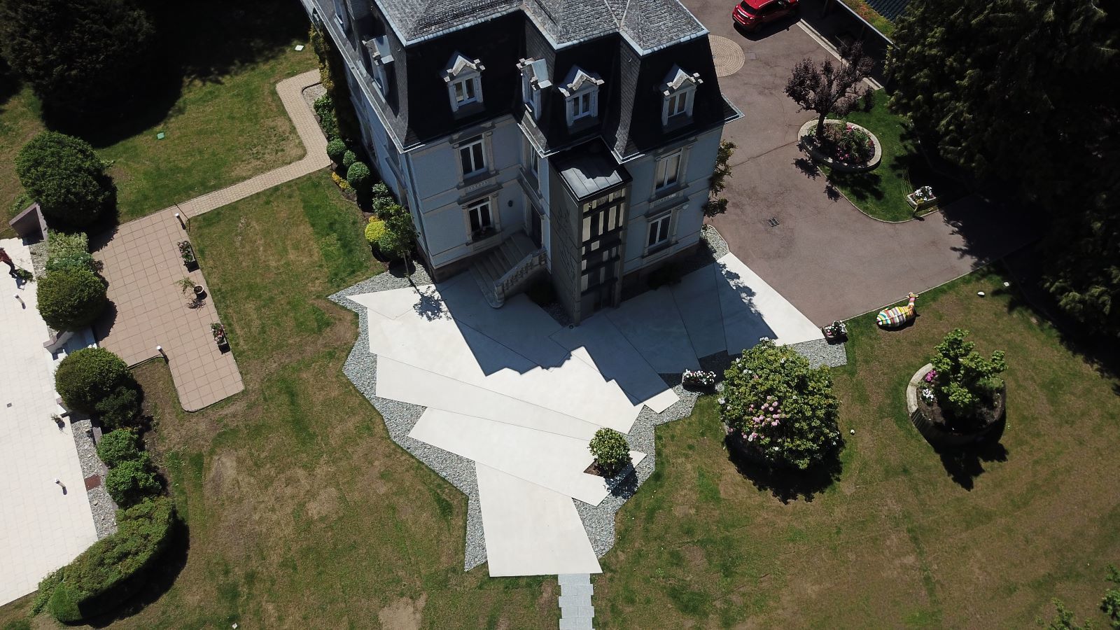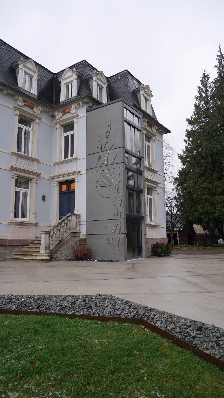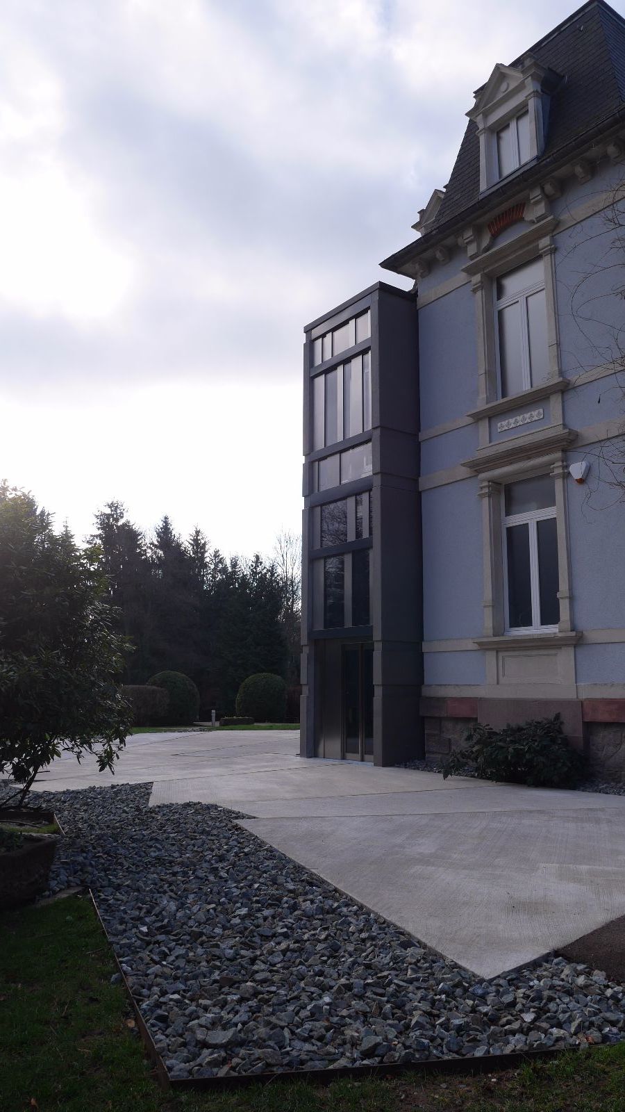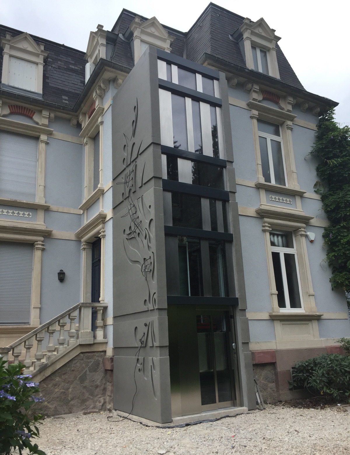 Juxtaposition brutale du béton brut et de l'ancien. Choix d'une cage massive en relation avec l'existant.