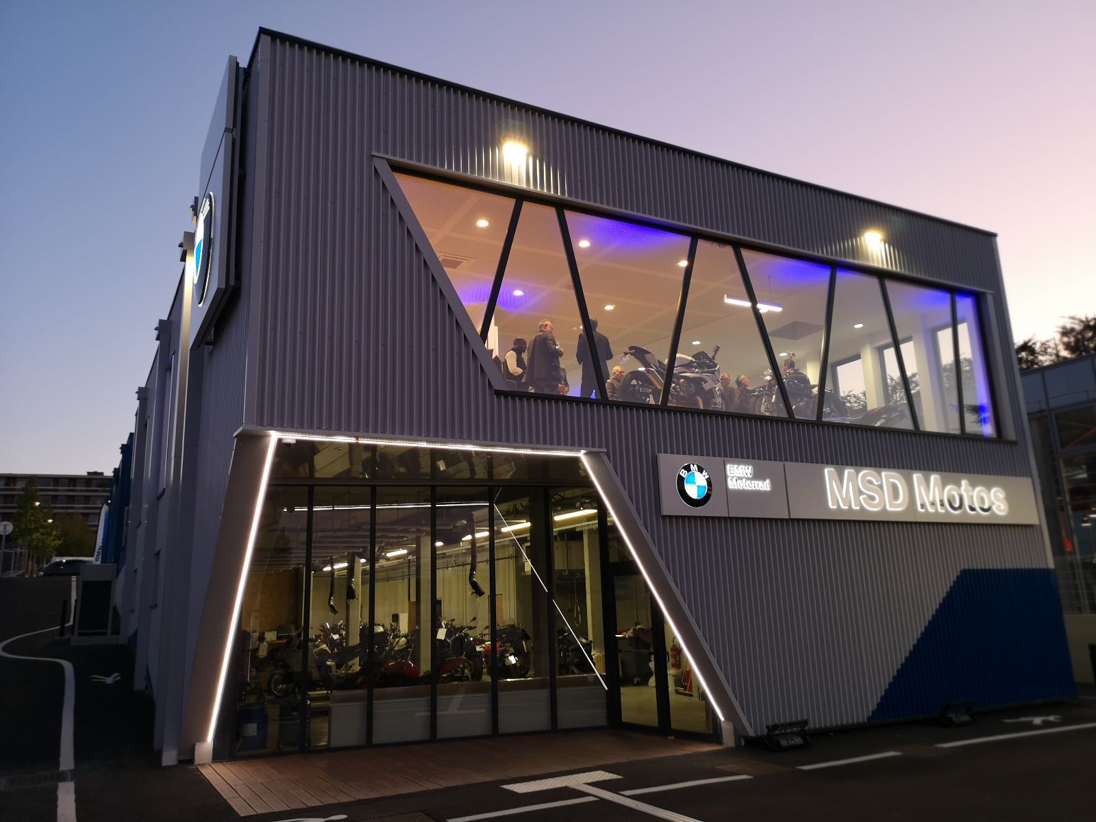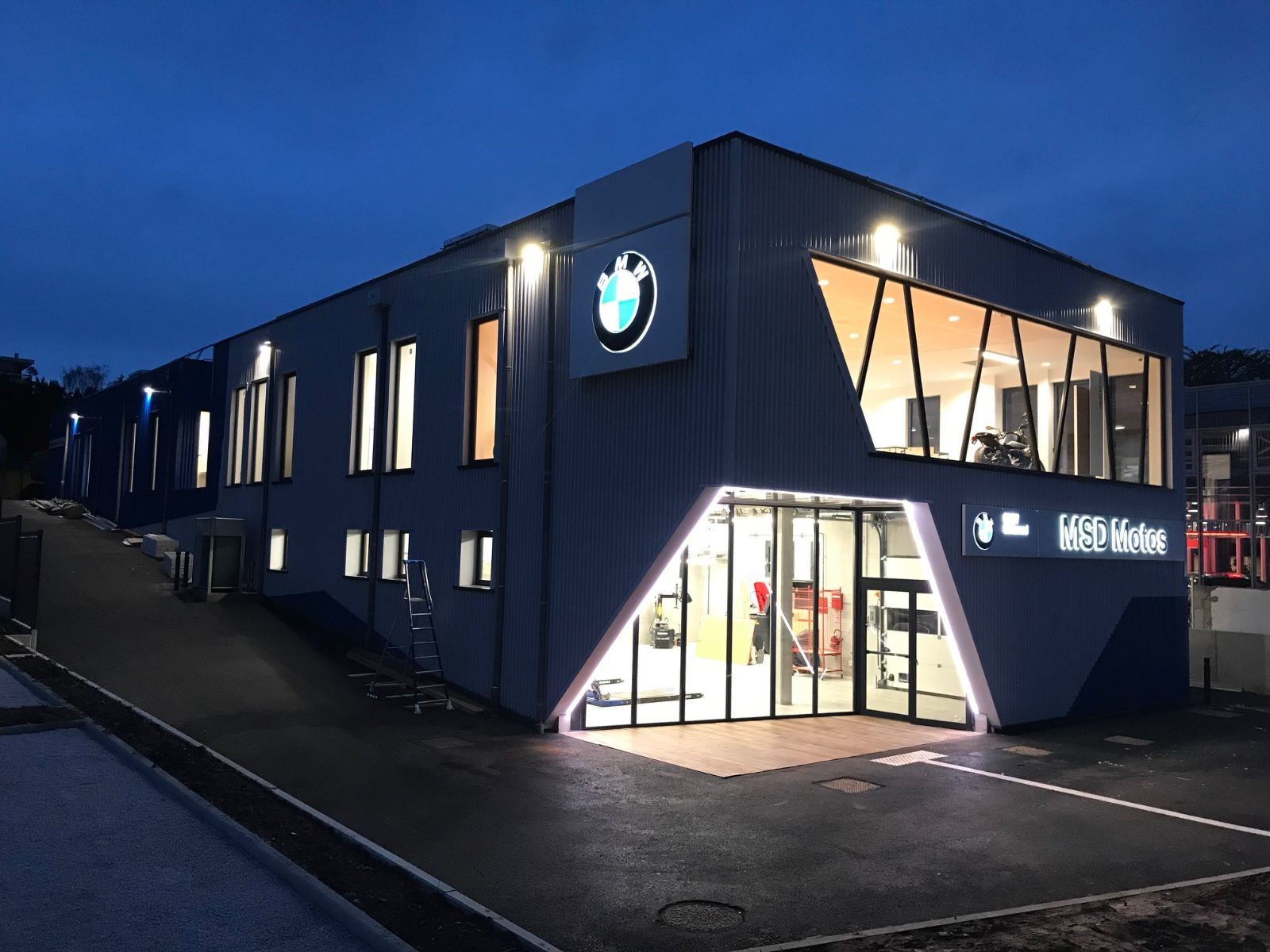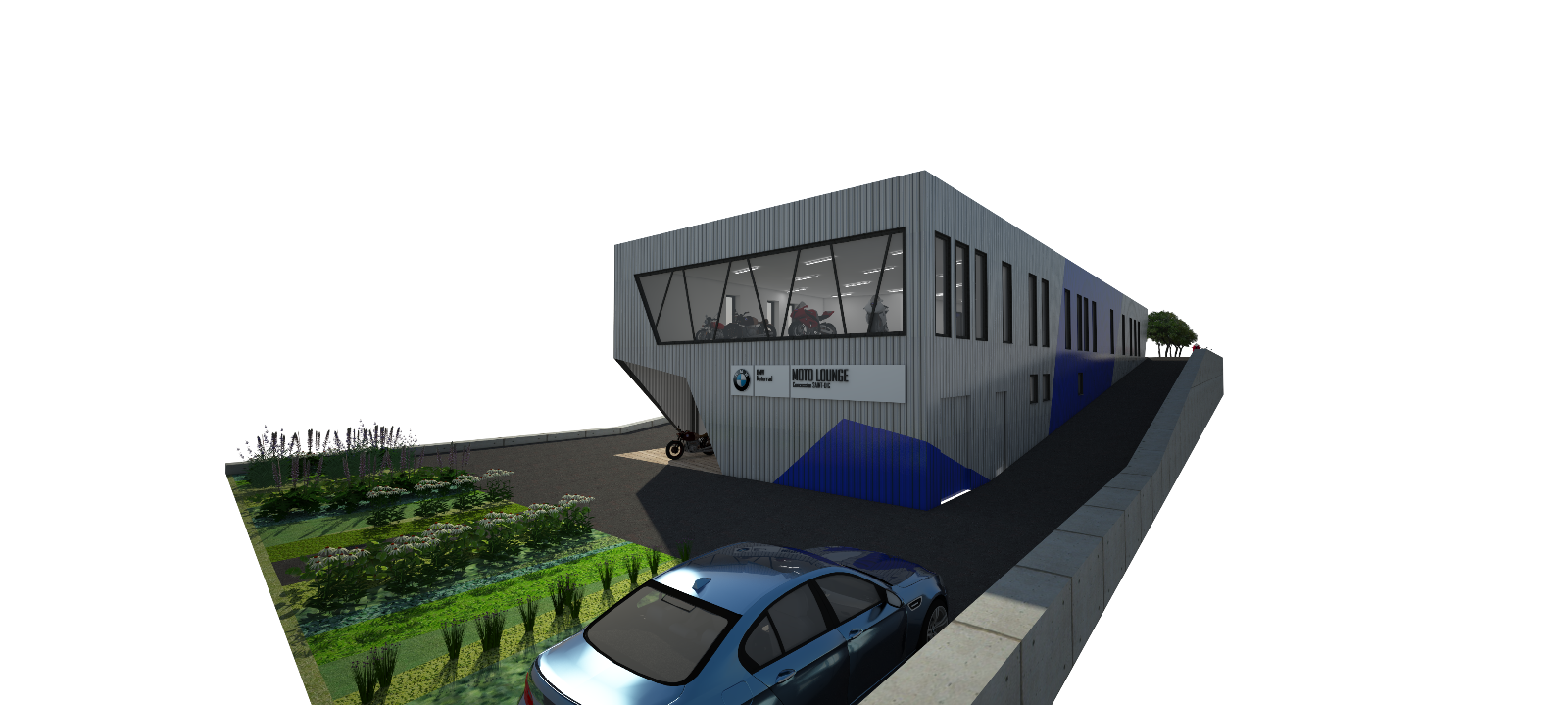 Dans un soucis de coût maîtrisé, le bâtiment se dote d'une vêture classique type bac acier mais en utilisant deux coloris afin de générer une dynamique aux façades. Toujours dans ce soucis de rythme et de dynamisme, les angles sont tronqués pour casser l'effet "boîte". La ligne "biaise" revient également au travers de l'aménagement intérieur mais aussi sur les menuiseries principales.
