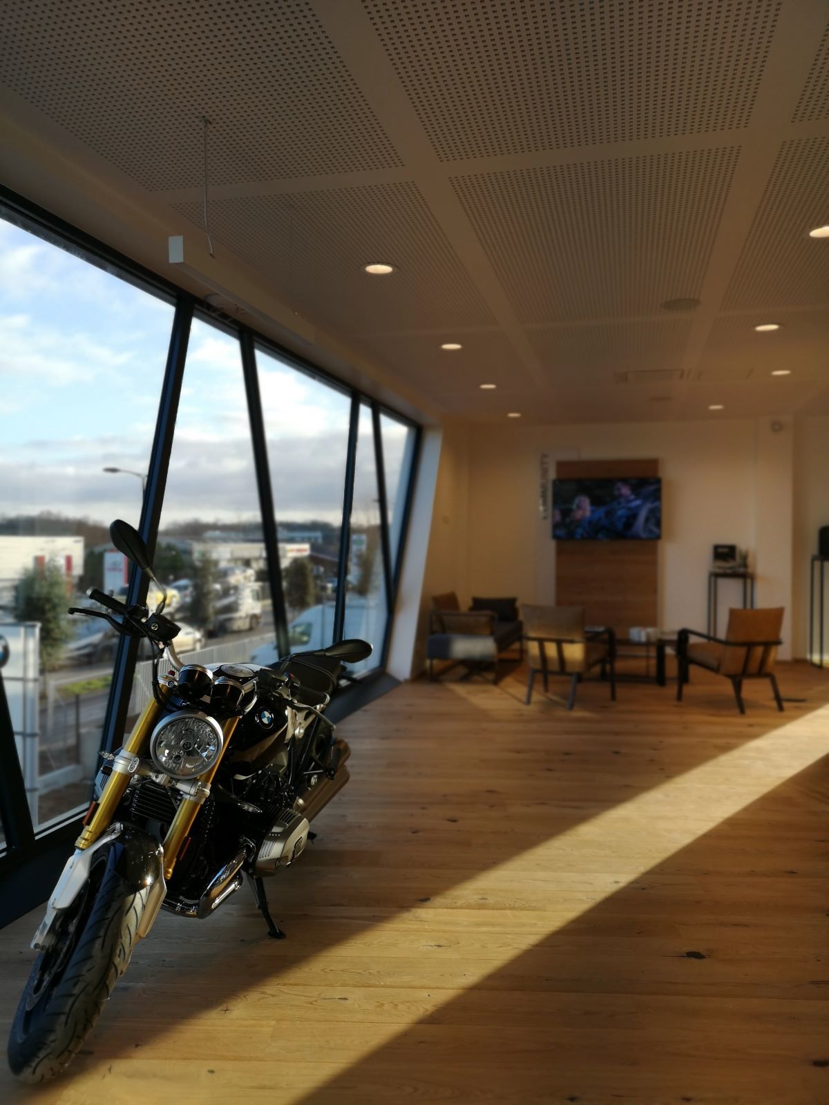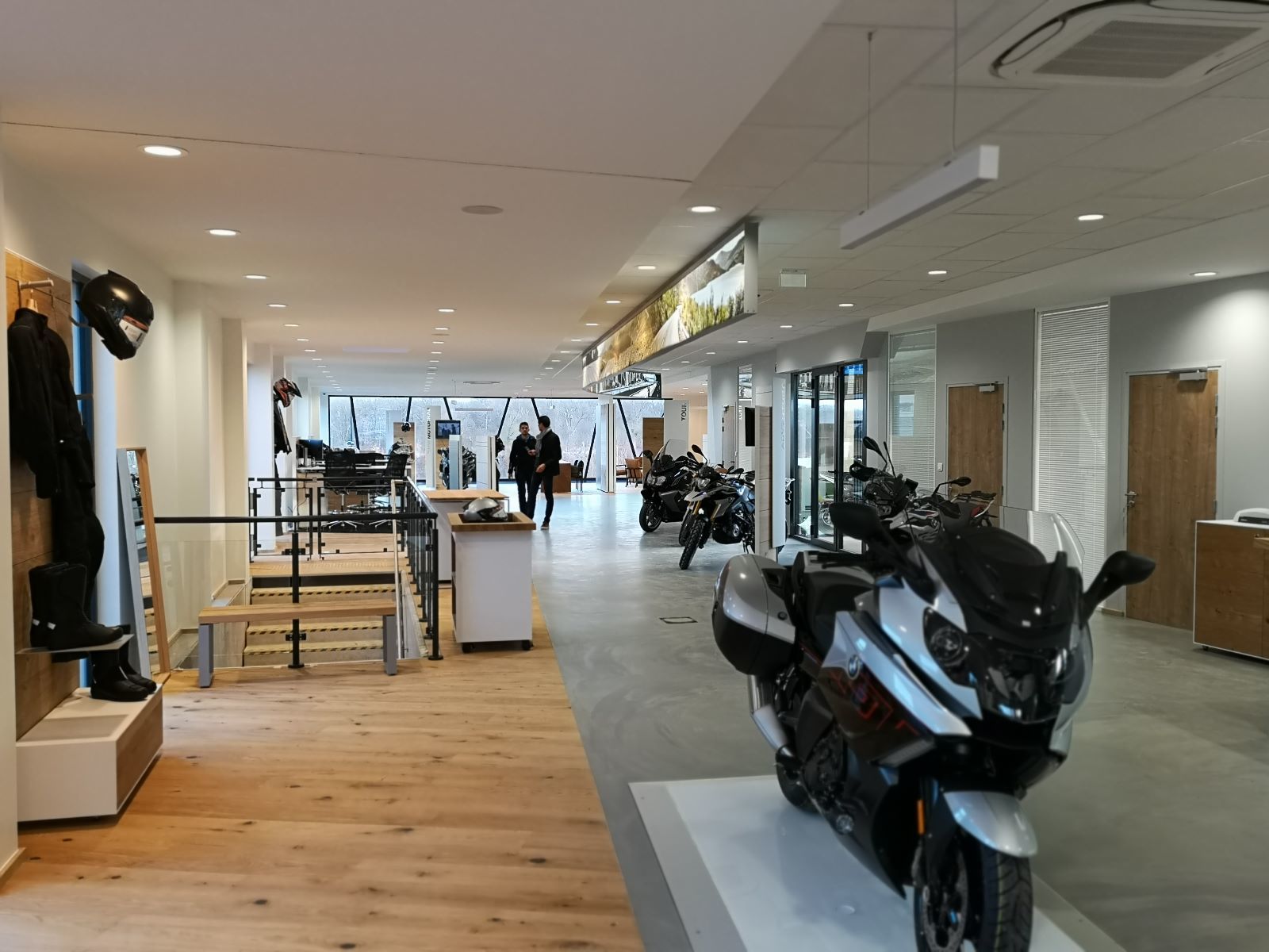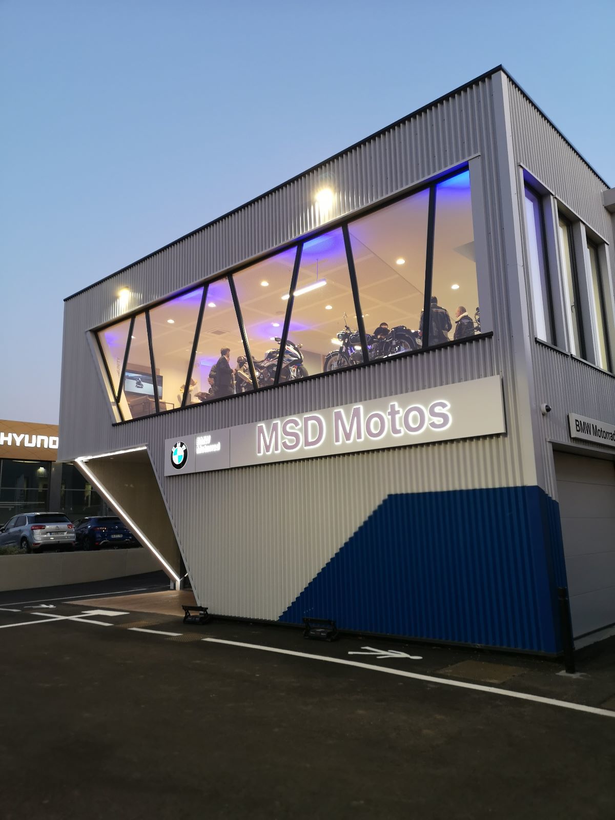 Dans un soucis de coût maîtrisé, le bâtiment se dote d'une vêture classique type bac acier mais en utilisant deux coloris afin de générer une dynamique aux façades. Toujours dans ce soucis de rythme et de dynamisme, les angles sont tronqués pour casser l'effet "boîte". La ligne "biaise" revient également au travers de l'aménagement intérieur mais aussi sur les menuiseries principales.