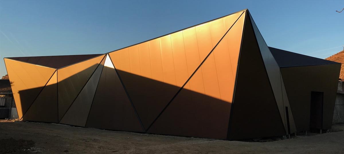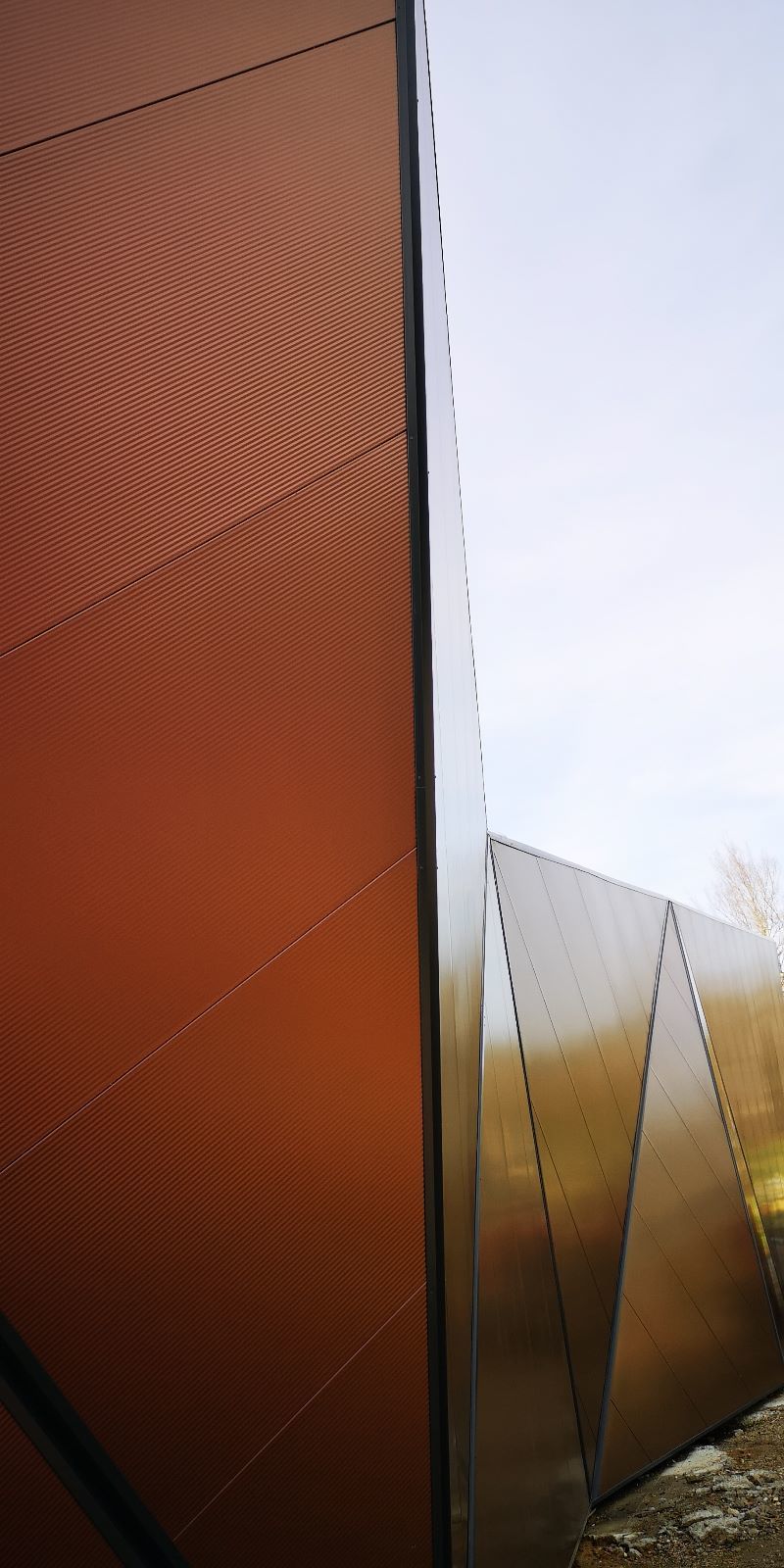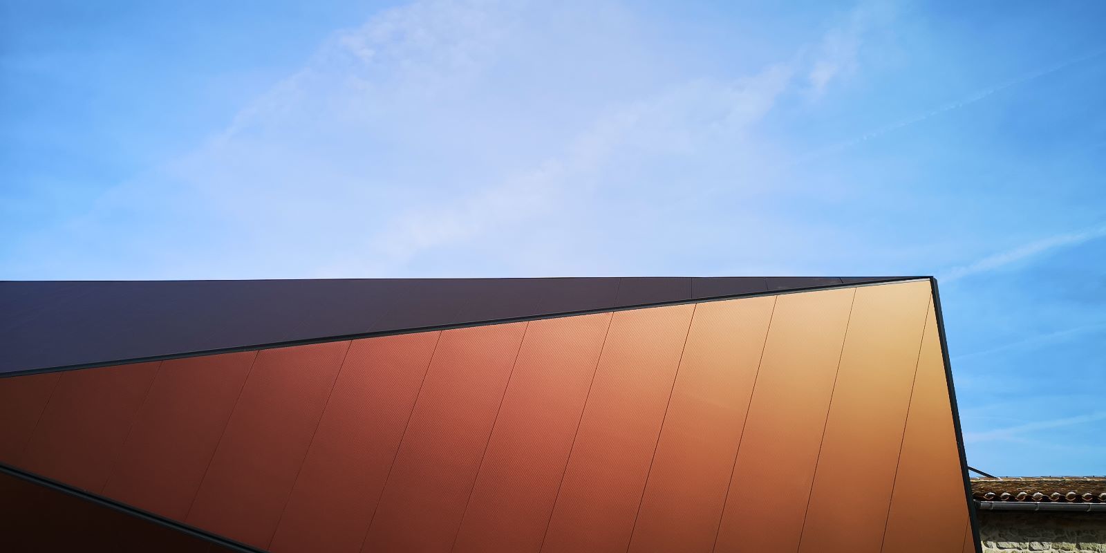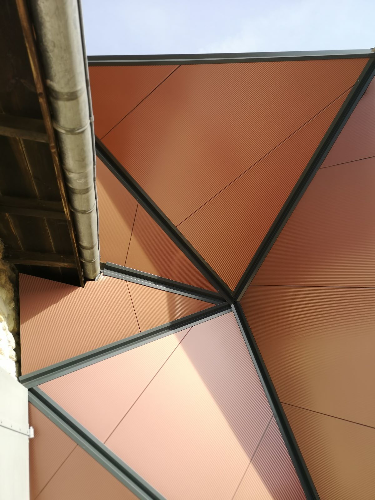 Plusieurs finitions, aspects ont été envisagés pour la « carapace », allant du « corten » en passant par de la toile tendue. Seule la teinte générale et l’ambiance étaient évidentes pour M.Canonne et moi-même, à savoir rester dans une teinte chaude (orangée, cuivrée) afin de rester en dialogue avec le site et les toitures existantes.