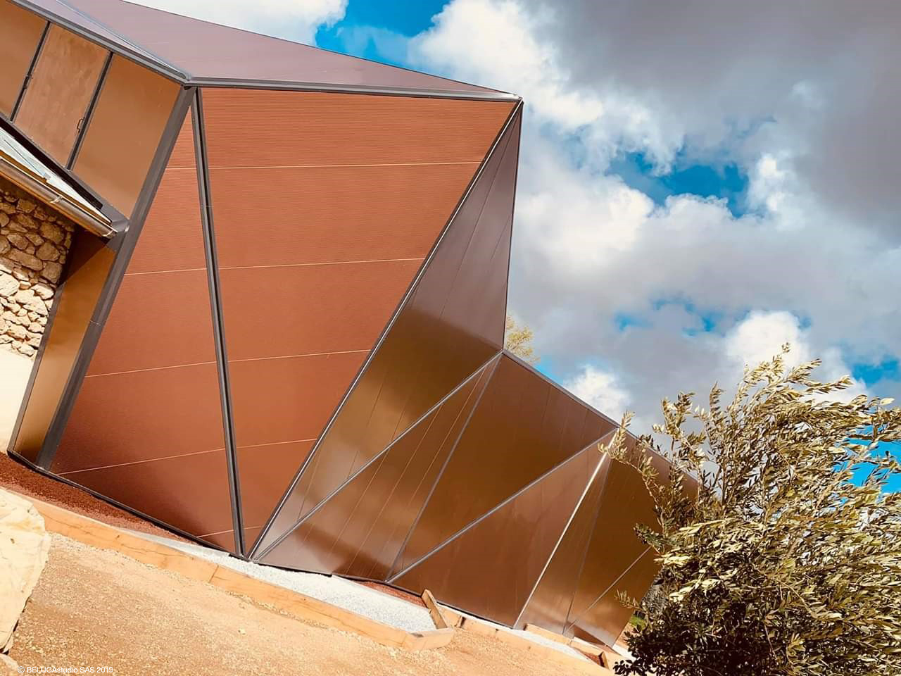 La solution volumétrique retenue fût dès lors de faire de cette « carapace » un élément fort et emblématique, en corrélation avec le site et le vin.