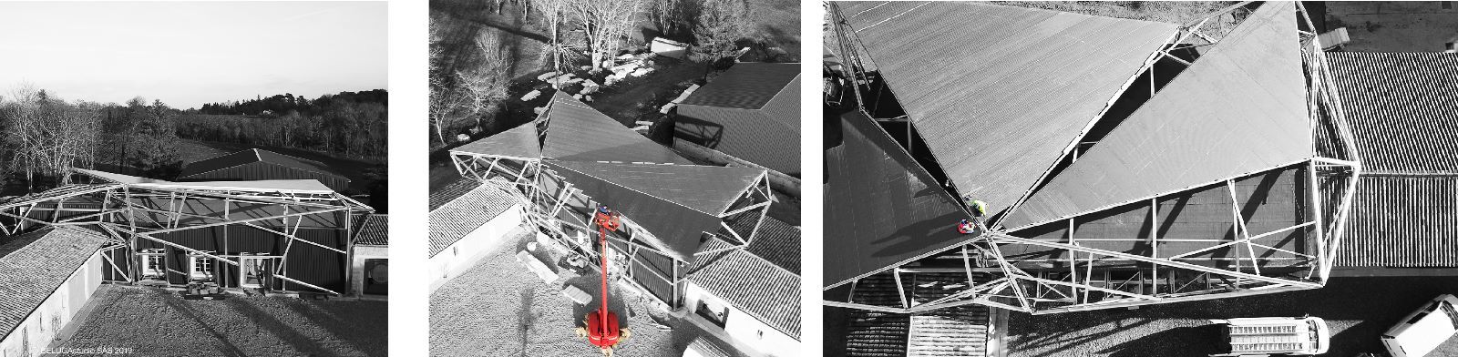 Le dessin de la « carapace » et accidents de formes s’adaptent et répondent à leur environnement. Par exemple, la pointe en extrémité de la « carapace » répond à la tour d’entrée, alors qu’aujourd’hui la toiture plonge. Cette réhausse permets également de stabiliser l’ensemble en contrebalançant la façade d’entrée.