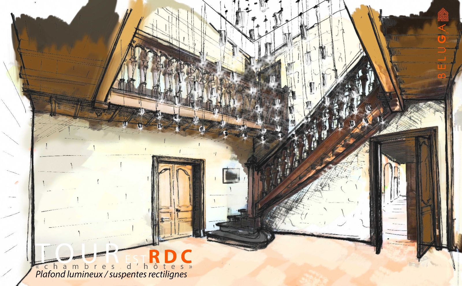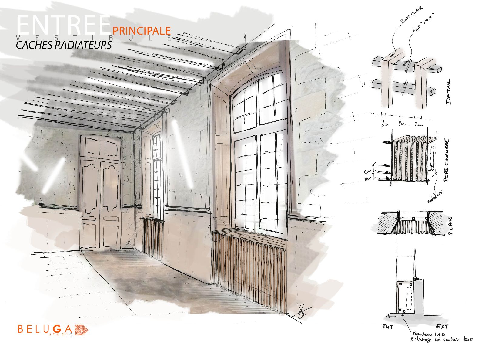 Le premier impact visuel est classique, ancien, mais une seconde lecture plus contemporaine apparait par transparence au travers des vitres, notamment par les éclairages en zigzag visibles en second jour dans le vestibule.
