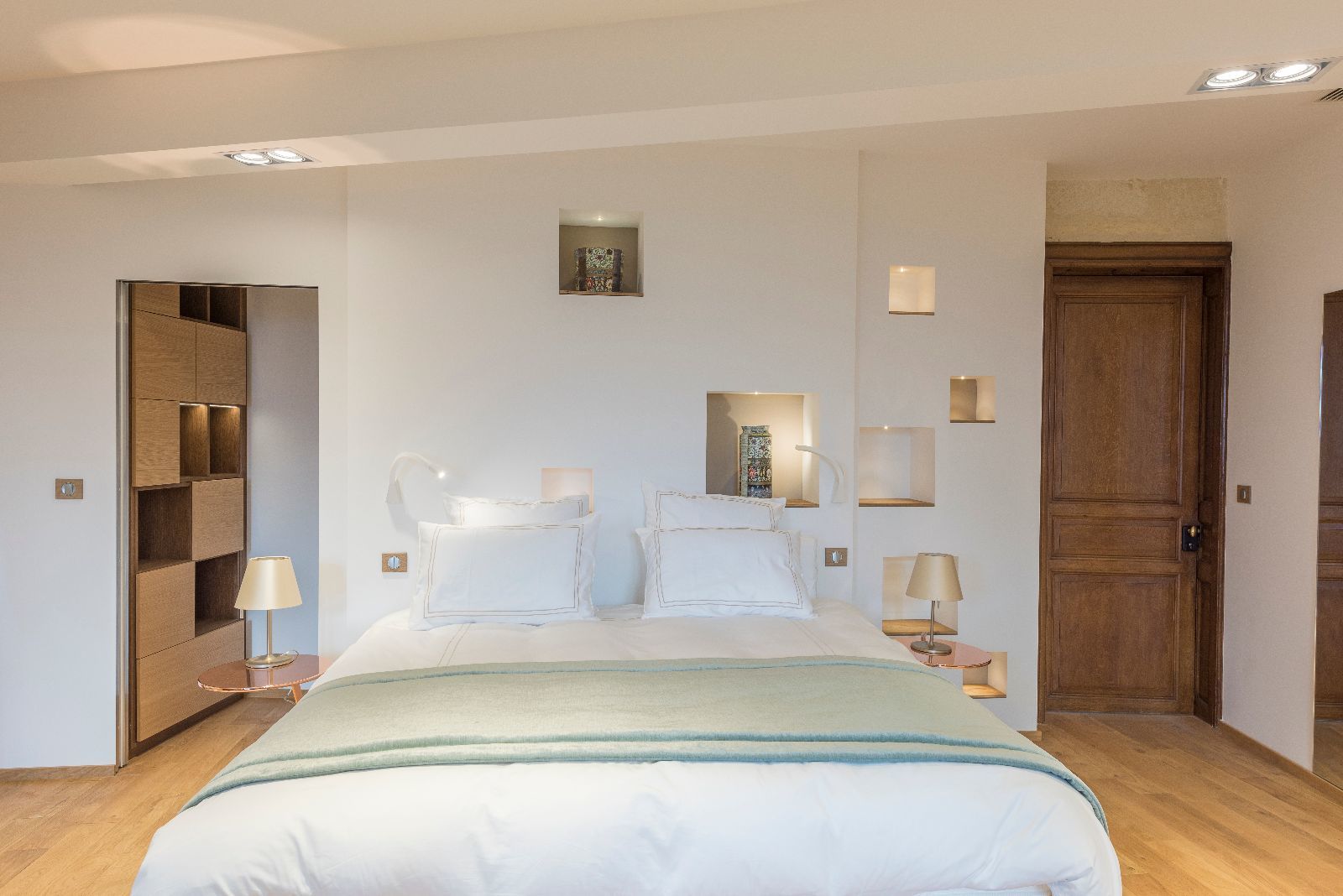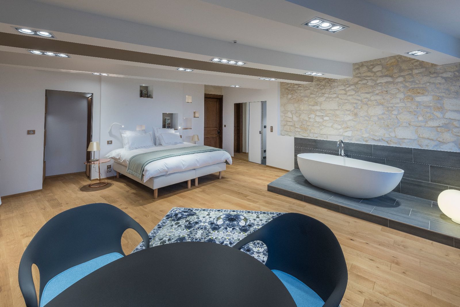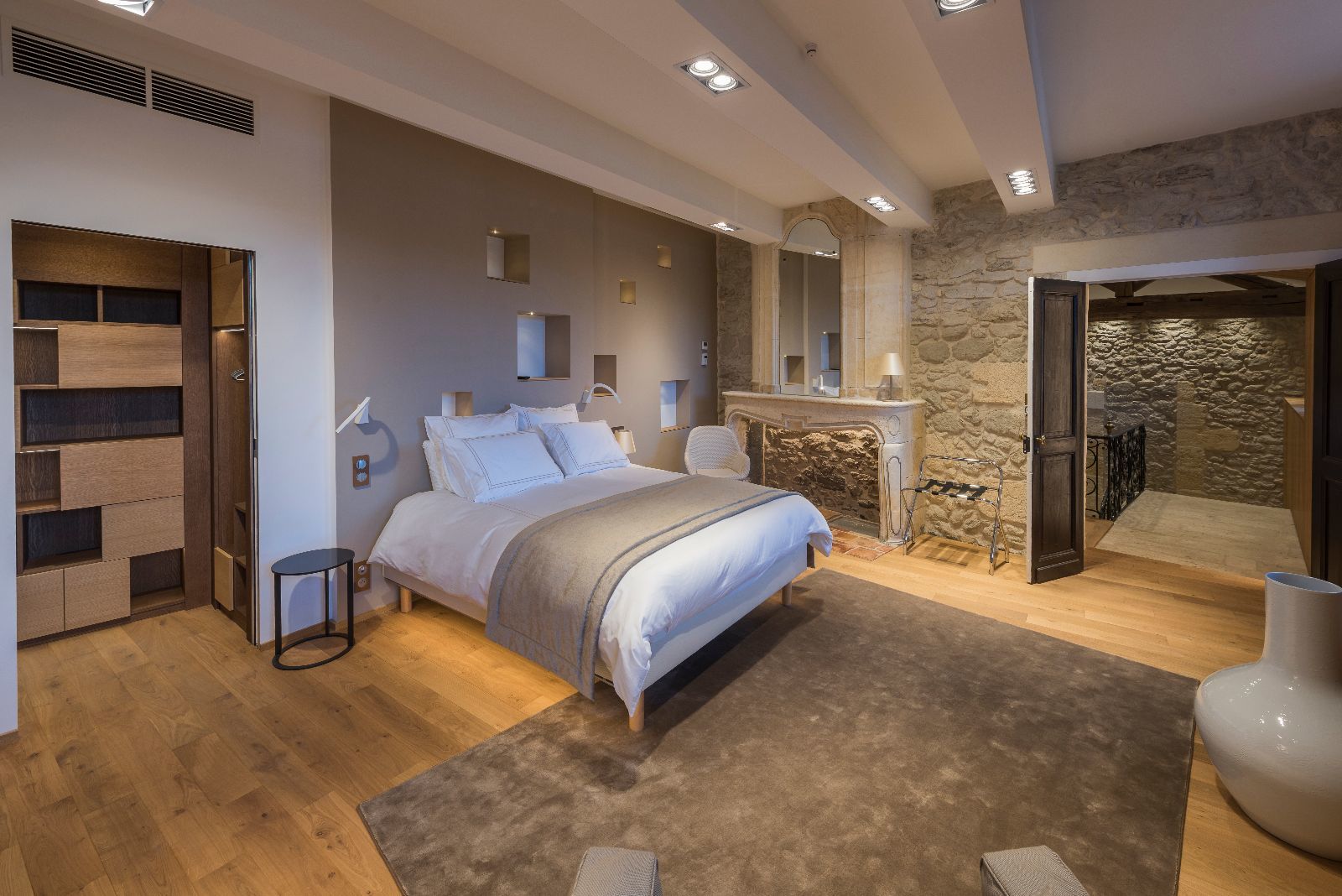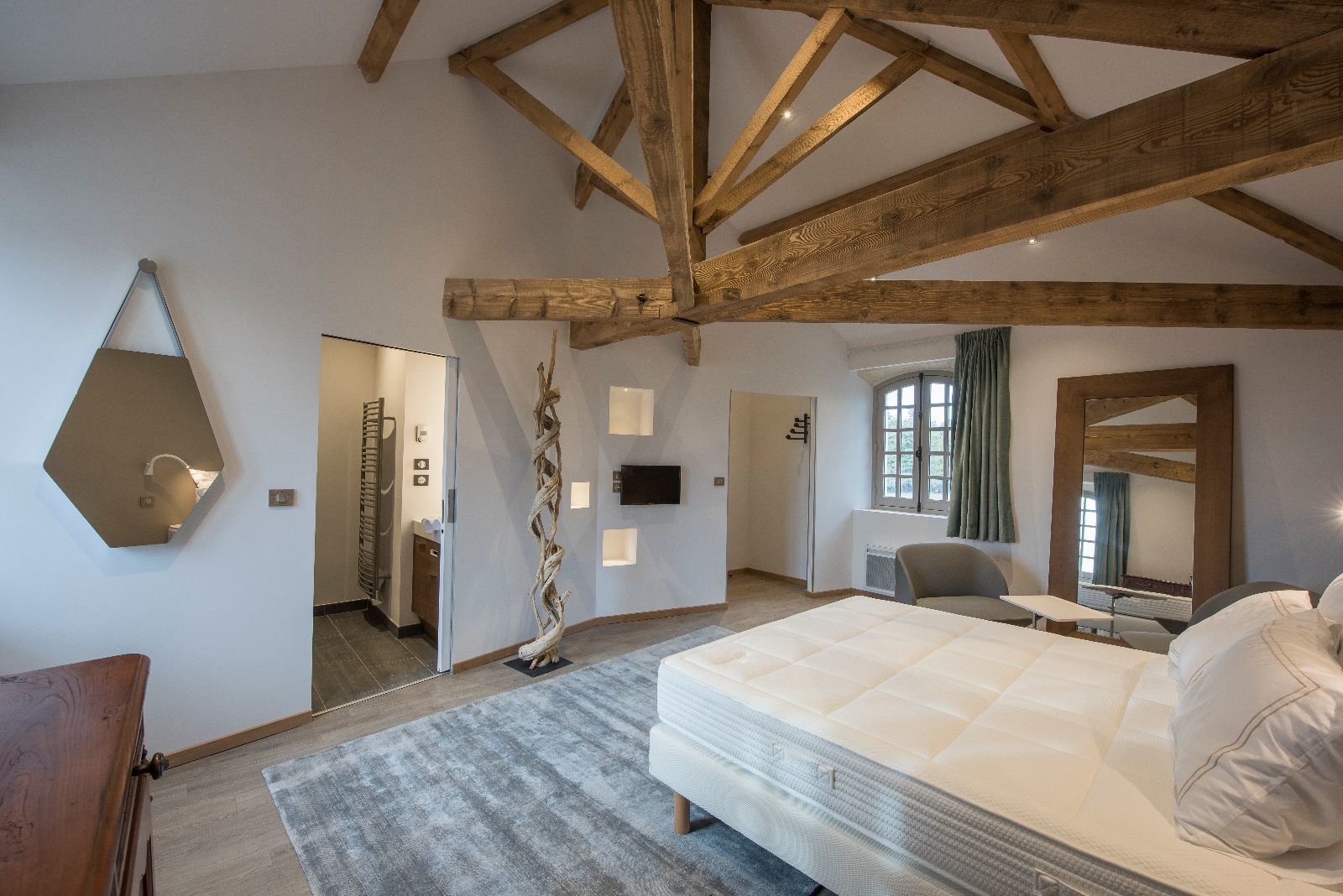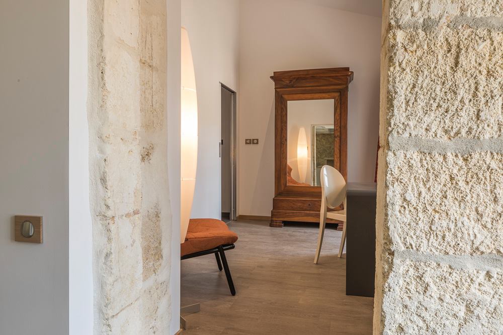 L'ensemble des chambres présente ainsi des murs obliques et des poutres massives également de biais, afin de casser le rythme des pièces. L'objectif est de surprendre, de perturber à la fois le regard et les sens, dans la douceur, pour laisser le temps de la découverte.