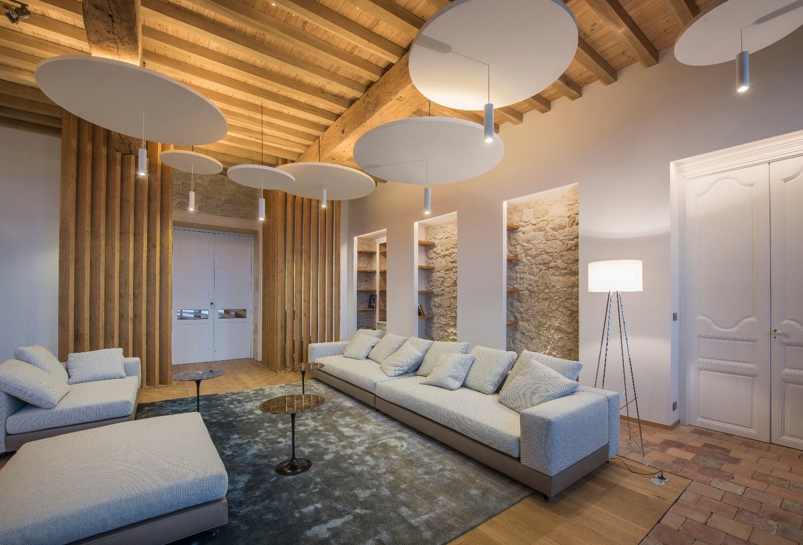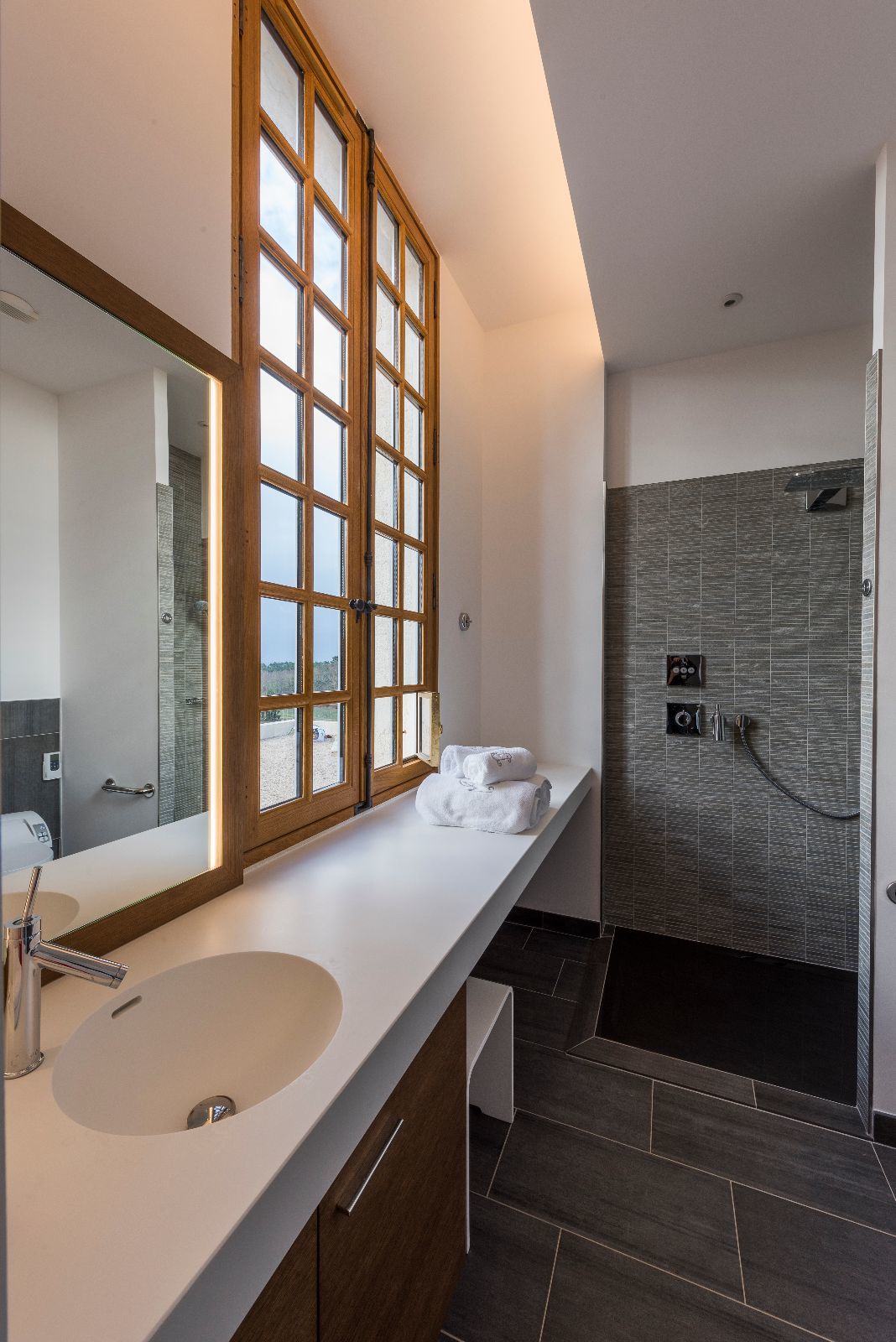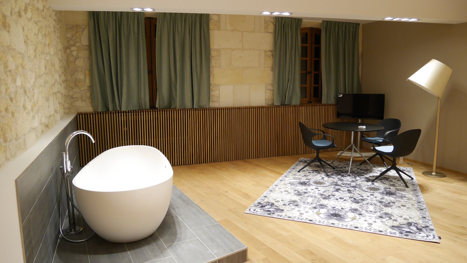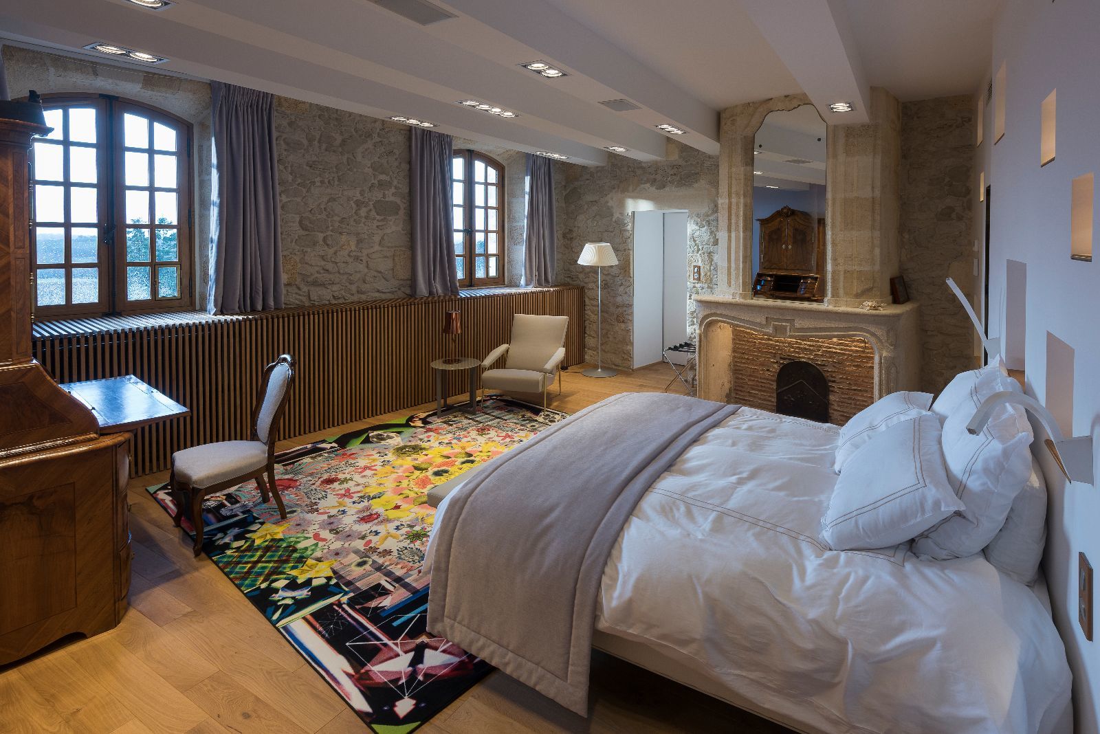 L'ensemble des chambres présente ainsi des murs obliques et des poutres massives également de biais, afin de casser le rythme des pièces. L'objectif est de surprendre, de perturber à la fois le regard et les sens, dans la douceur, pour laisser le temps de la découverte.