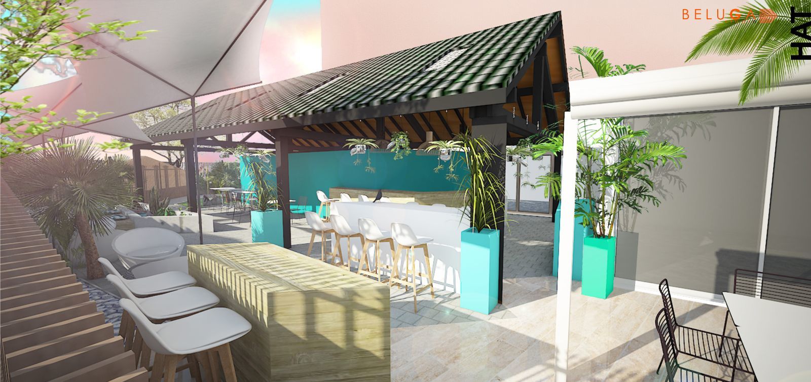 Mise à distance de l'extérieur et intimisation par des claustras bois et des végétaux.